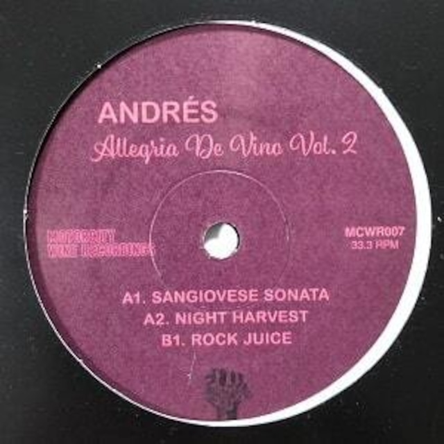 ANDRES - Allegria de Vino Vol. 2 7インチ盤です MOTORCITY WINE RECORDINGS | MCWR007 | US | 2020 ワインを介して音楽を楽しむデトロイトのベニュー MOTORCITY WINEよりAndres (aka DJ Dez)が2種類リリースするインストEPシリーズのパート2!! (SIDE A) 1) Sangiovese Sonata 2) Night Harvest (SIDE B) 1) Rock Juice 盤質:綺麗な中古盤