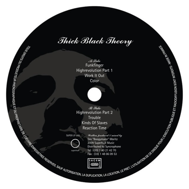 Teo "Boogymann" Moritz / Thick Black Theory Label:Superhuit france ▼Tracklist A1 Funkfinger 4:10 A2 Highrevolution Part 1 4:27 A3 Work It Out 4:18 A4 Color 3:50 B1 Highrevolution Part 2 4:14 B2 Trouble 5:38 B3 Kinds Of Slaves 4:46 B4 Reaction Time 盤・ジャケットコンディション:EX+
