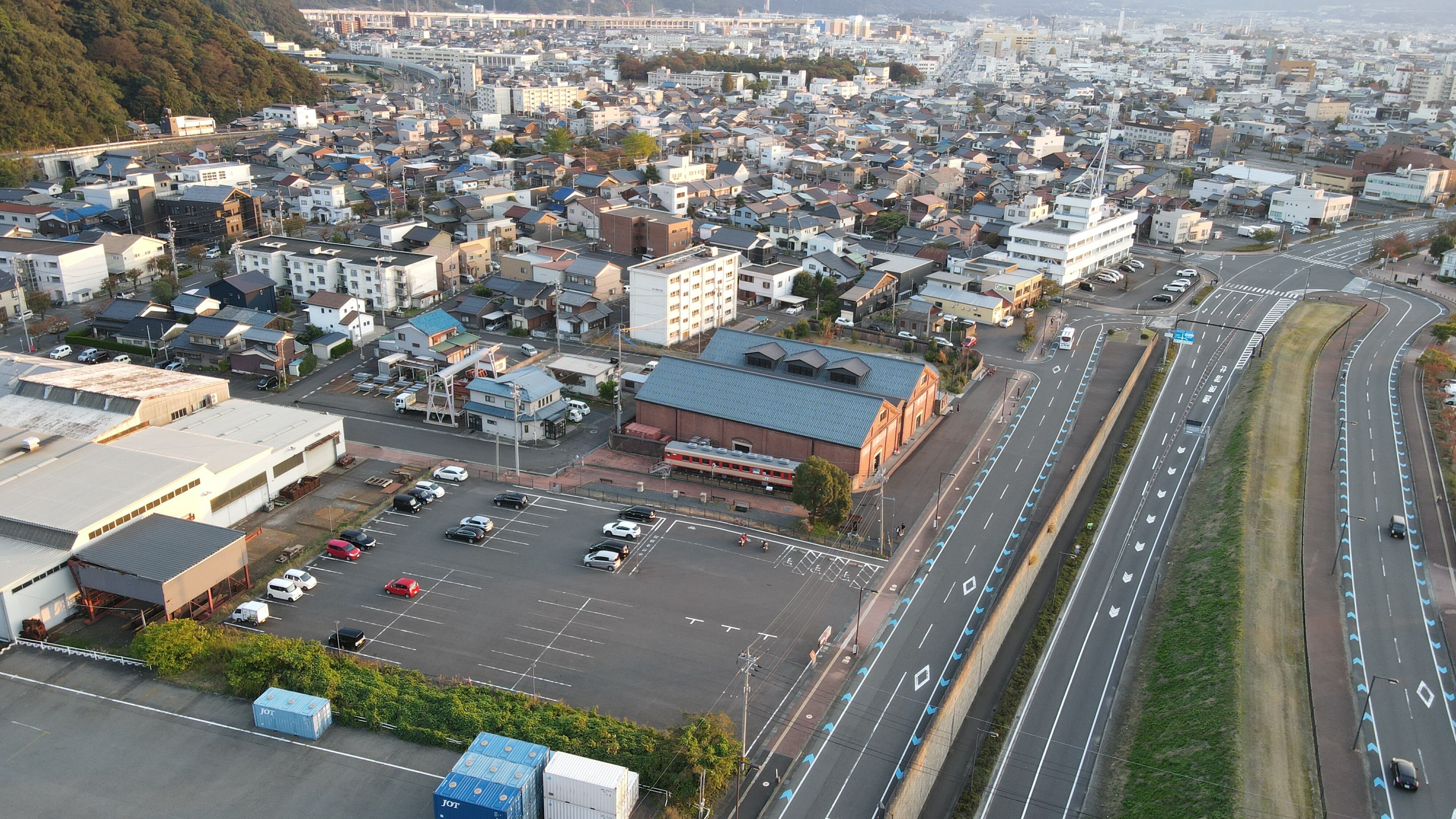 福井県敦賀市赤レンガ倉庫・金ヶ崎緑地ドローン画像です。
